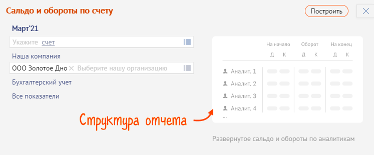 Во всех отчетах можно настроить детализацию по субсчетам, документам и периодам.