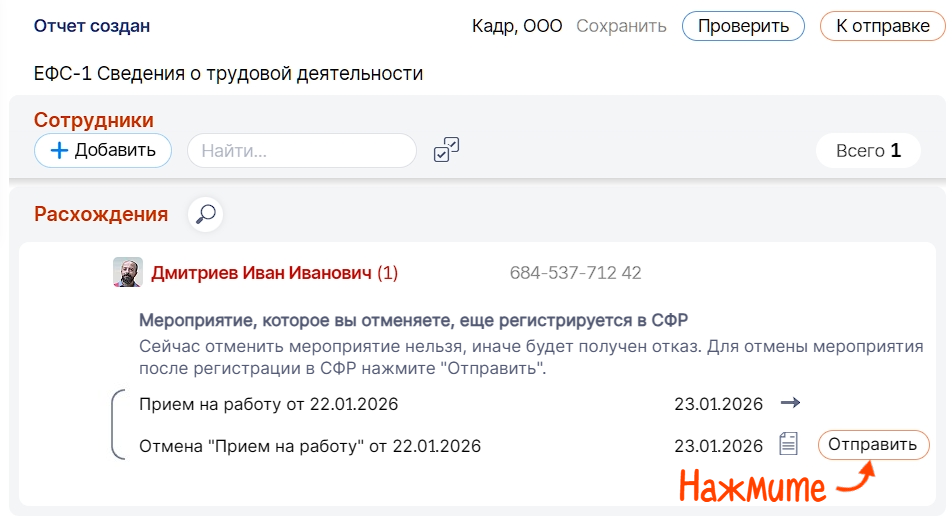 Попытку отменить еще не зарегистрированное в СФР кадровое мероприятие.