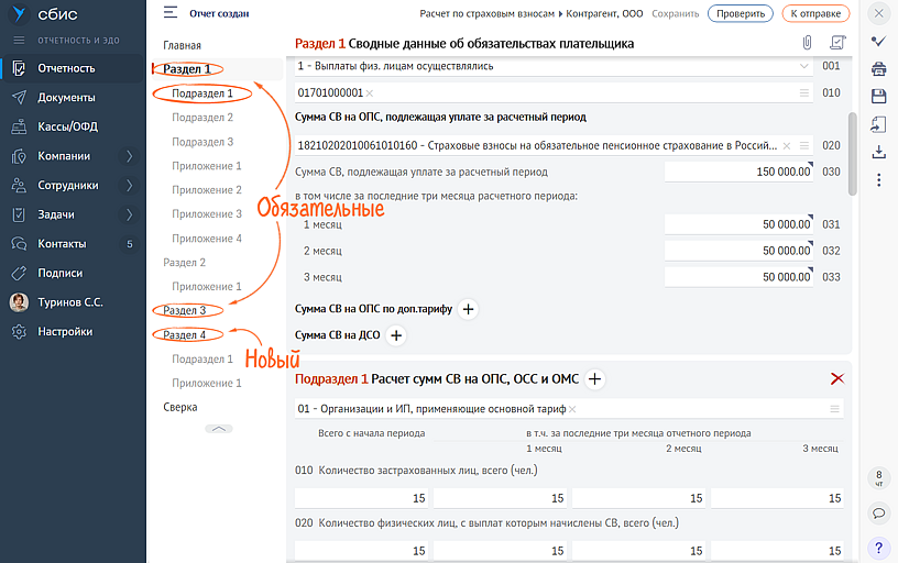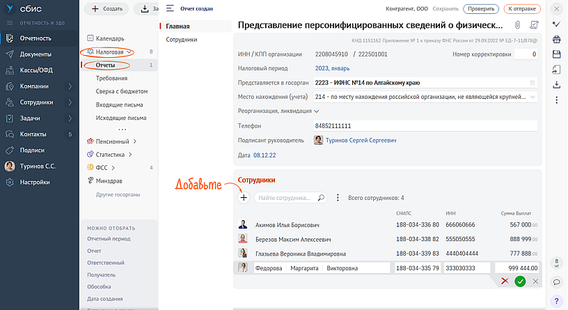 Мы уже подготовили форму персонифицированного учета. Просто выберите ее в разделе «Отчетность/Налоговая» по кнопке «Создать».