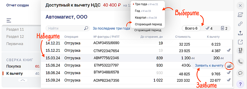 Отобрать нужные фактуры. Пока не заявленные, уже заявленные или все — по быстрым фильтрам в верхней части страницы. Также можно установить период: 3 года, год, квартал или сгорающий.