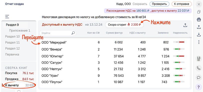 Успеть возместить НДС вовремя. Специальный стикер покажет сумму НДС, которая скоро сгорит. Перейдите по нему к фактурам, которые надо срочно заявить к вычету.