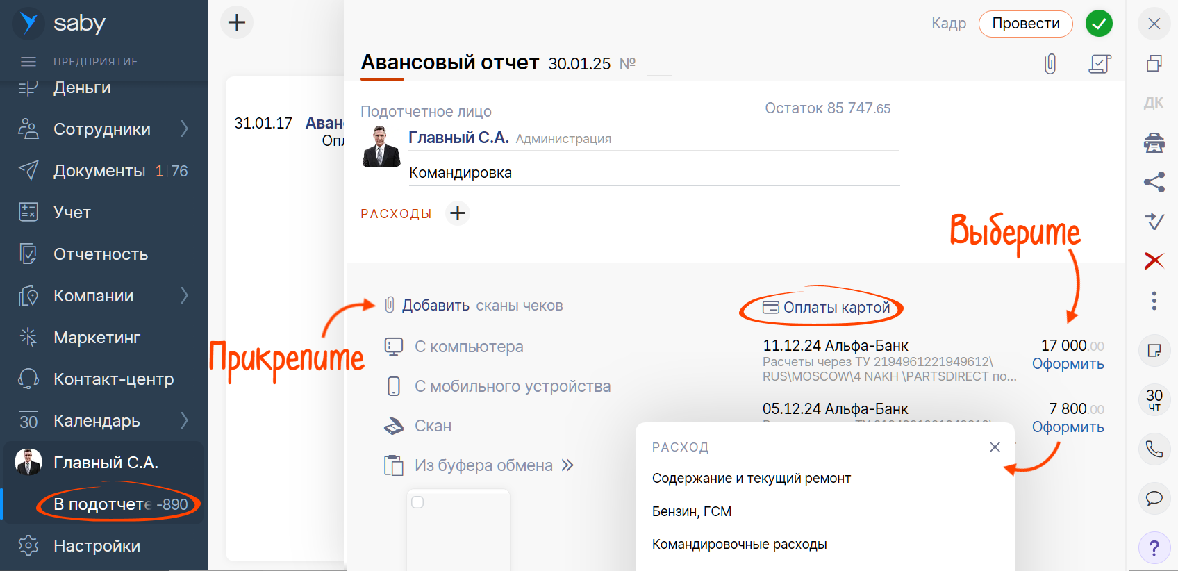 • Быстро сформировать авансовый отчет. Выберите из списка оплату и статью расходов — Saby сам заполнит сумму и счет затрат. Останется только прикрепить подтверждающий документ, ввести комментарий и провести отчет.