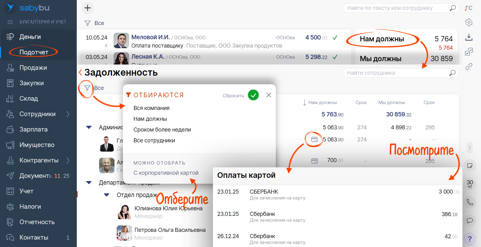 • Контролировать задолженности по картам в одном окне. В разделе «Нам должны» кликните на значок карты напротив сотрудника, чтобы увидеть, за какие оплаты он еще не отчитался.