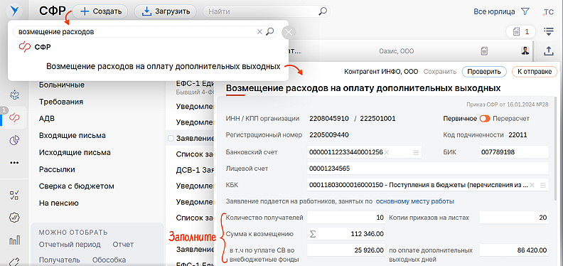 Заполните количество получателей и сумму к возмещению с разбивкой по СВ и оплате выходных.