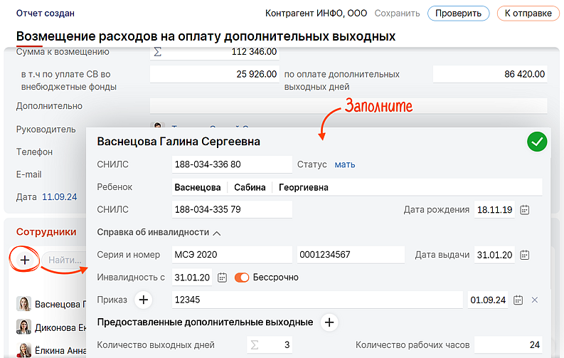Внесите сведения о каждом работнике и ребенке-инвалиде. Укажите количество выходных, реквизиты справки об инвалидности и приказа о дополнительном отпуске.