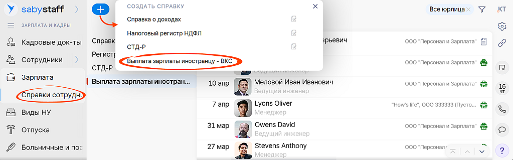 Оформляете зарплату в Saby. Если у вас работают высококвалифицированные зарубежные специалисты, раз в квартал надо сдавать уведомление о выплате им зарплаты. Форма доступна в разделе «Справки сотрудникам» На вкладке «Выплата зарплаты иностранцу».