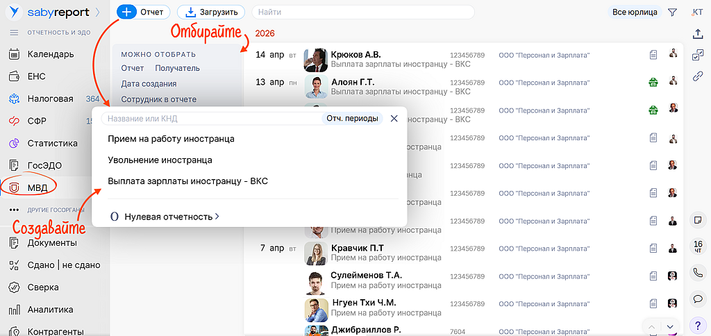 Только сдаете отчетность в Saby. Все формы легко создать, отправить и отслеживать в новом разделе «МВД/Отчеты». Вы можете фильтровать их по дате, типу отчета или сотруднику.