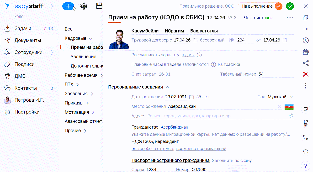 Если ведете у нас КЭДО. При оформлении документа приема или увольнения работника с иностранным гражданством система сама предложит уведомить УФМС прямо из чек-листа кадрового документа и предзаполнит отчет.