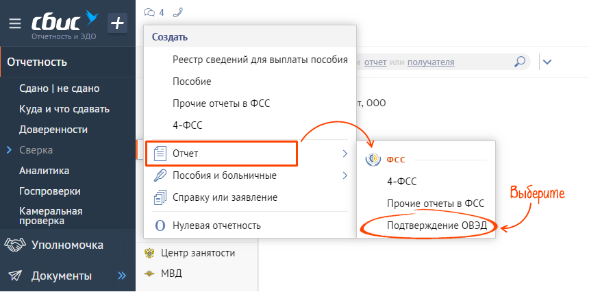 С января прошлого года ФСС принимает подтверждение и в электронном виде, поэтому вы легко можете отправить его в СБИС через специальную форму отчета «Подтверждение ОВЭД». Для отправки в СБИС вам нужно просто создать новый отчет «Подтверждение ОВЭД» и заполнить все поля в форме. В ответ вы получите уведомление, что вид деятельности подтвержден. Заполнить отчет поможет инструкция.