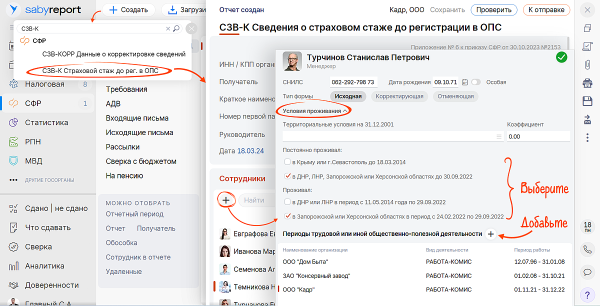 Создайте форму в разделе «СФР/Отчеты». Добавьте сотрудников и заполните сведения по каждому из них. Проверьте и отправьте отчет.