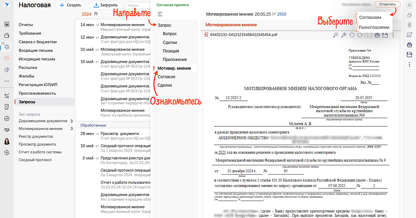 Направить запрос и получить мотивированное мнение от ФНС.