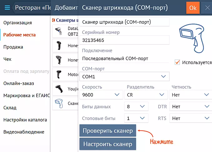 Убедитесь, что 2D-сканер подключен к рабочему месту и корректно считывает коды маркировки. Для этого перейдите в настройки рабочего места и нажмите «Проверить сканер».