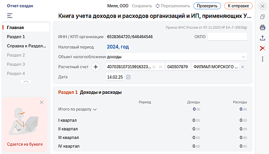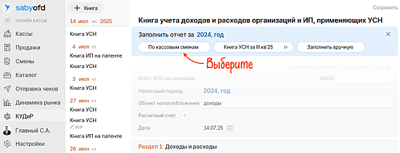 Сформируйте книгу учета в разделе «КУДиР». Все, что нужно, — выбрать режим, организацию и период. Saby предложит варианты заполнения, в том числе по кассовым сменам.
