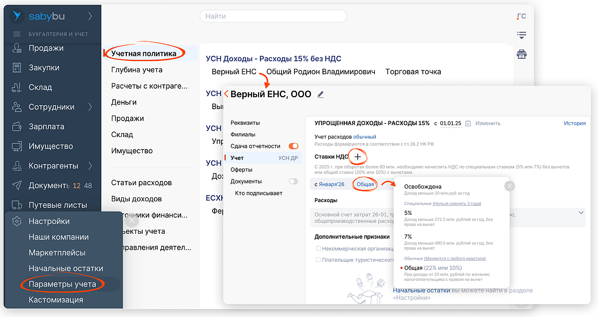 Если за 2025 год вы остаетесь в пределах 20 млн ₽, режим работы не меняется: вы продолжаете применять УСН без НДС, дополнительные настройки в Saby не нужны.