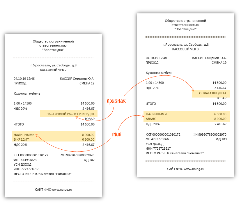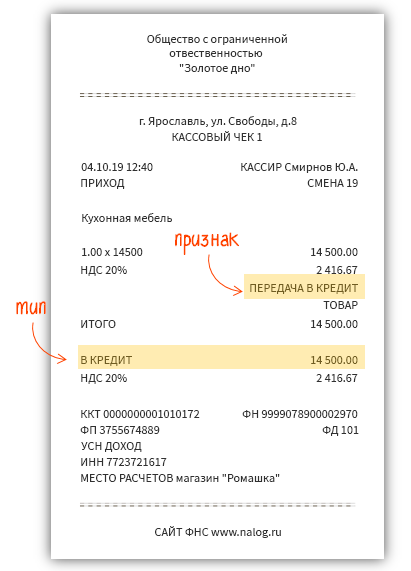 1. При передаче товара без первоначального взноса в чеке указываем: