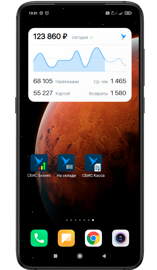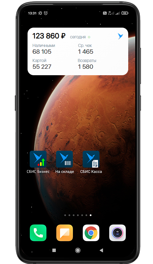 Выбирайте размер и оформление виджета, отображаемую информацию и располагайте на экране, где хотите. Выручка, средний чек и возвраты на виду, без входа в приложение.