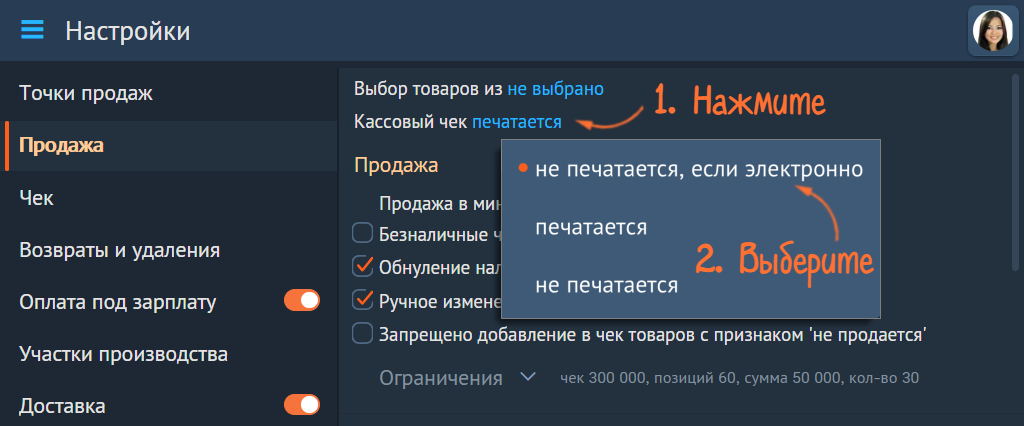 В настройках точки продаж в разделе «Продажи» выберите правила печати бумажного чека. Если покупателю будет отправлен электронный чек, бумажный напечатан не будет.