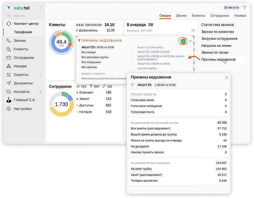 10+ детальных причин недозвонов вместо трех статусов. Saby поможет понять, почему вы теряете клиентов на звонках. Система зафиксирует, в какой точке маршрута и в связи с чем завершился входящий звонок. Например, если операторы заняты, сотрудник не на работе или клиент кладет трубку на автоинформаторе.