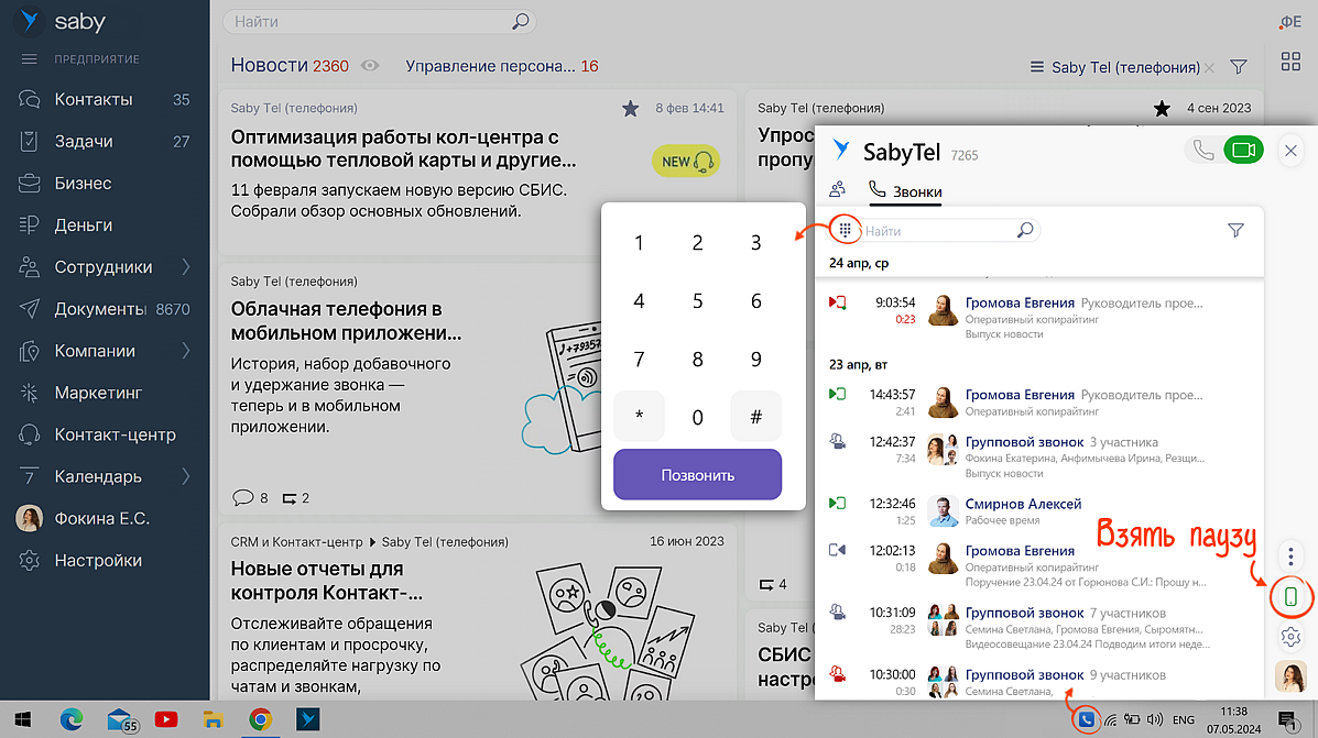 SabyTel — софтфон, который синхронизируется с online.saby.ru. В отличие от Сбисофона, для работы SabyTel не нужно заходить в кабинет. Это значит, что вы не пропустите звонок, если закрыли Saby, а также не придется искать вкладку со звонком в браузере.