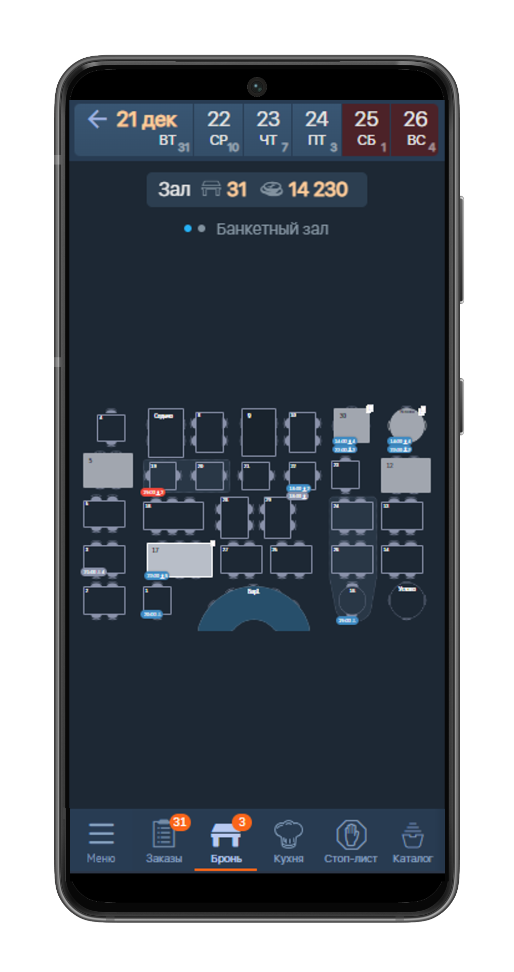Управляйте залом, как авиадиспетчер, и оформляйте заказы прямо на схеме зала. Выберите столик, укажите количество гостей, добавьте блюда и отправьте заказ на кухню — всего за несколько касаний.
