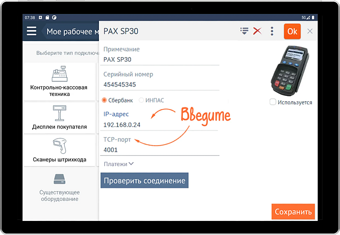 Подключение по TCP/IP поддерживают не все модели платежных терминалов. Уточните возможности вашего устройства у специалиста банка.