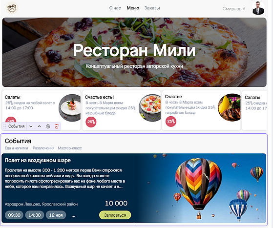 Приглашать клиентов на курсы и мероприятия — быстрее, проще и удобнее. Настраивайте карусель событий, создавайте для них страницы и запускайте запись на мероприятия в мобильной версии Saby Get и брендированных приложениях. Рекламируйте мастер-классы, курсы и творческие встречи на сайтах доставки с помощью виджета «События» — это поможет поддерживать интерес клиентов к бренду.