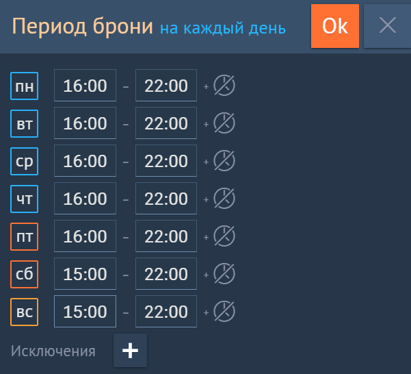Уникальный режим работы для каждого дня. У вас есть очень нагруженные дни, когда гости идут один за другим, и администратору приходится потрудиться, чтобы рассадить всех? Или в вашем заведении есть дни или даже часы, когда бронь не должна быть доступна? В настройках виджета вы может выставить тот режима для каждого дня, который подойдет именно вам.