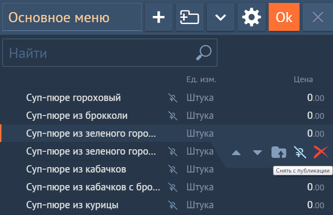 В настройках меню в разделе "Каталог" вам достаточно снять отметку о публикации у нужных позиций, и данное блюдо не будет отображать в виджете при формировании предзаказа.