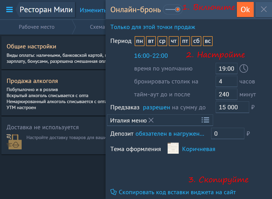 Предзаказ и депозит. Presto позволяет вам самим решить, будет ли у вас предзаказ, в какие дни и на какую общую сумму. Здесь же вы можете указать обязательность и сумму депозита за столик. Кроме того, вы можете выбрать нужное меню для показа в виджете, при этом совсем не обязательно создавать отдельное меню, если вы хотите, чтобы какие-то позиции были не доступны для онлайн-заказа.