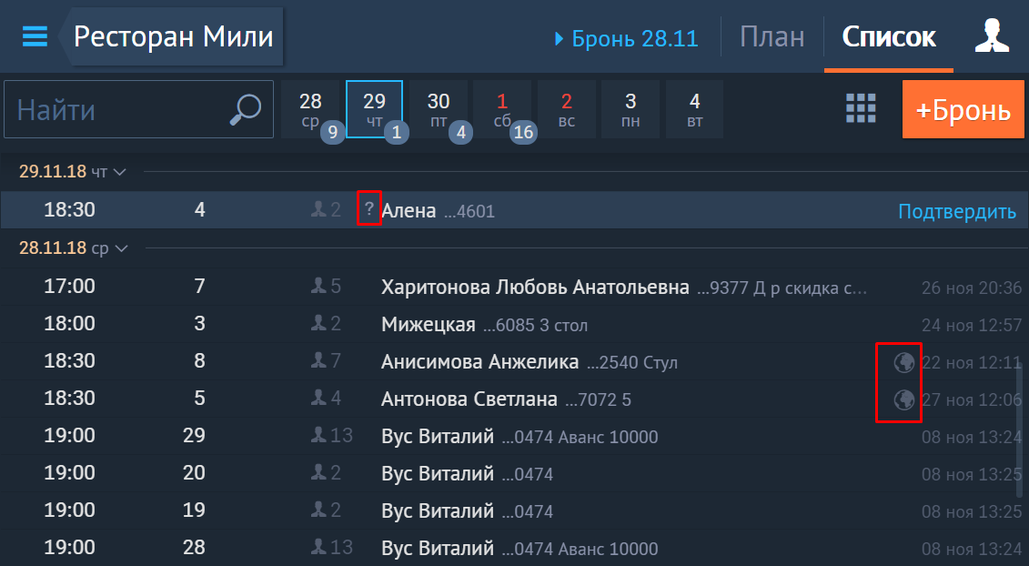 Все онлайн-брони администратор сможет увидеть в реестре заказов и на схеме зала, такие онлайн-брони будут показываются с иконками со знаком вопроса, подсказывающими, что бронь следует подтвердить. Подтвержденная бронь получается иконку глобуса, и вы всегда можете увидеть сколько броней было создано "вручную", а сколько пришло из интернета.