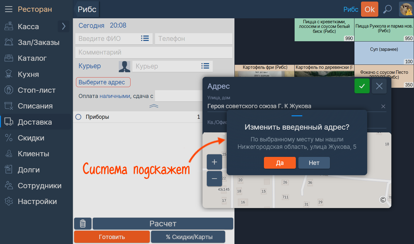 Если адрес есть на карте, но название улицы введено с ошибкой или изменилось, система предложит правильный вариант. Пользователь может согласиться или оставить свой вариант — в таком случае нужно дополнительно указать район обслуживания.