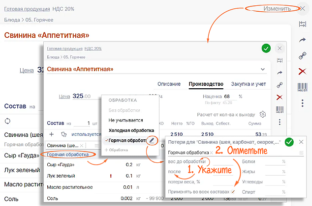 Потери при кулинарной обработке продуктов зависят от способа приготовления и влияют на маржинальность блюда. Чтобы точнее учитывать их процент, вместо справочных параметров веса укажите собственные, настроив способ обработки. Используйте предустановленные типы, редактируйте их, добавляйте новые — прямо в карточке блюда или продукта.