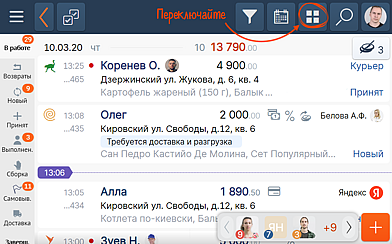 Расширенные фильтры. Отбирайте заказы по конкретному периоду, покупателю, району обслуживания или скидке. Используйте фильтр по неоплаченным заказам и фильтр по курьерам — перемещайте его по экрану в любое место и просматривайте детальную информацию по каждому сотруднику.