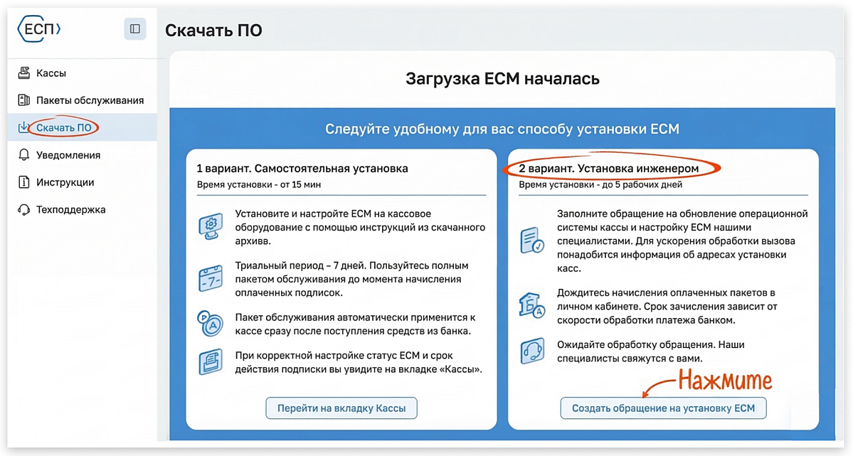 Зарегистрируйтесь на сайте ЕСП и купите пакет обслуживания. При покупке обязательно укажите наш код партнера 95842. Затем перейдите в раздел «Скачать ПО». Система предложит два варианта. Если вам нужна помощь, выберите второй — «Установка инженером».
