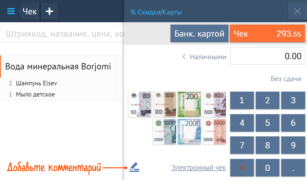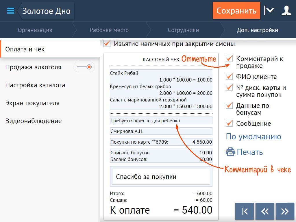 В настройках точки продаж перейдите на вкладку «Доп. настройки». В разделе «Оплата и чек» отметьте галочкой «Комментарий к продаже».