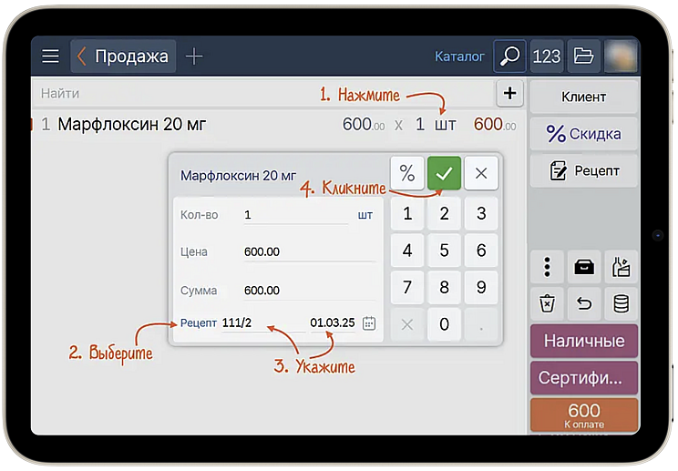 В окне розничной продажи выберите признак рецептурности и укажите номер и дату рецепта в открывшихся полях.