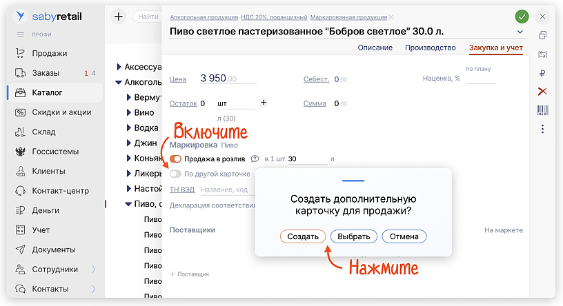 Как это работает: например, вы приняли к учету сыр целой головой в штуках, а продавать хотите в килограммах. Включите «Продажа фасовкой», создайте новую карточку (например, «Сыр фасованный») и укажите коэффициент пересчета (1 шт = 8 кг). При вскрытии Saby спишет одну голову сыра и добавит 8 кг фасованного товара. Код маркировки автоматически спишется в ГИС МТ. Подходит для товарных групп «Безалкогольные напитки», «Безалкогольное пиво», «Пиво» и алкоголя с акцизными марками. В карточке на вкладке «Закупка и учет» включите переключатель «Продажа в розлив», укажите объем кега или бутылки и настройте продажу в литрах. Для этого нажмите «По другой карточке» и создайте новую или выберите существующую.