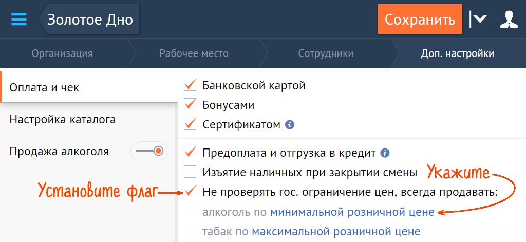 Перейдите в настройки точки продаж и укажите, что весь алкоголь, цена которого в каталоге ниже МРЦ, необходимо продавать по минимальной розничной цене.