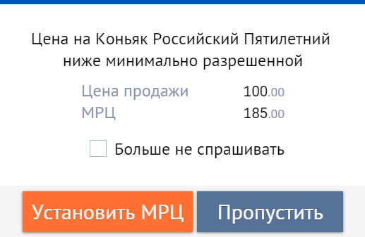 Если флаг в настройках точки продаж не установлен, при попытке добавить алкоголь по цене ниже минимальной в чек, кассир увидит предупреждение. Система предложит ему скорректировать цену в соответствии с требованиями закона или пропустить проверку и продать алкоголь по цене каталога.