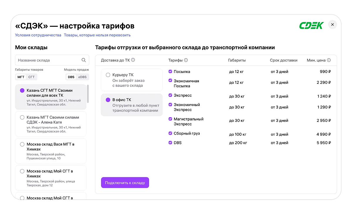 Отметьте галочкам подходящие тарифы отгрузки и кликните «Подключить к складу».