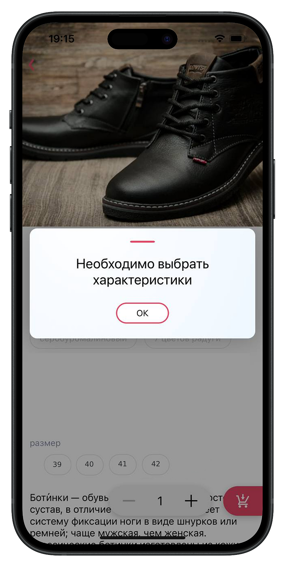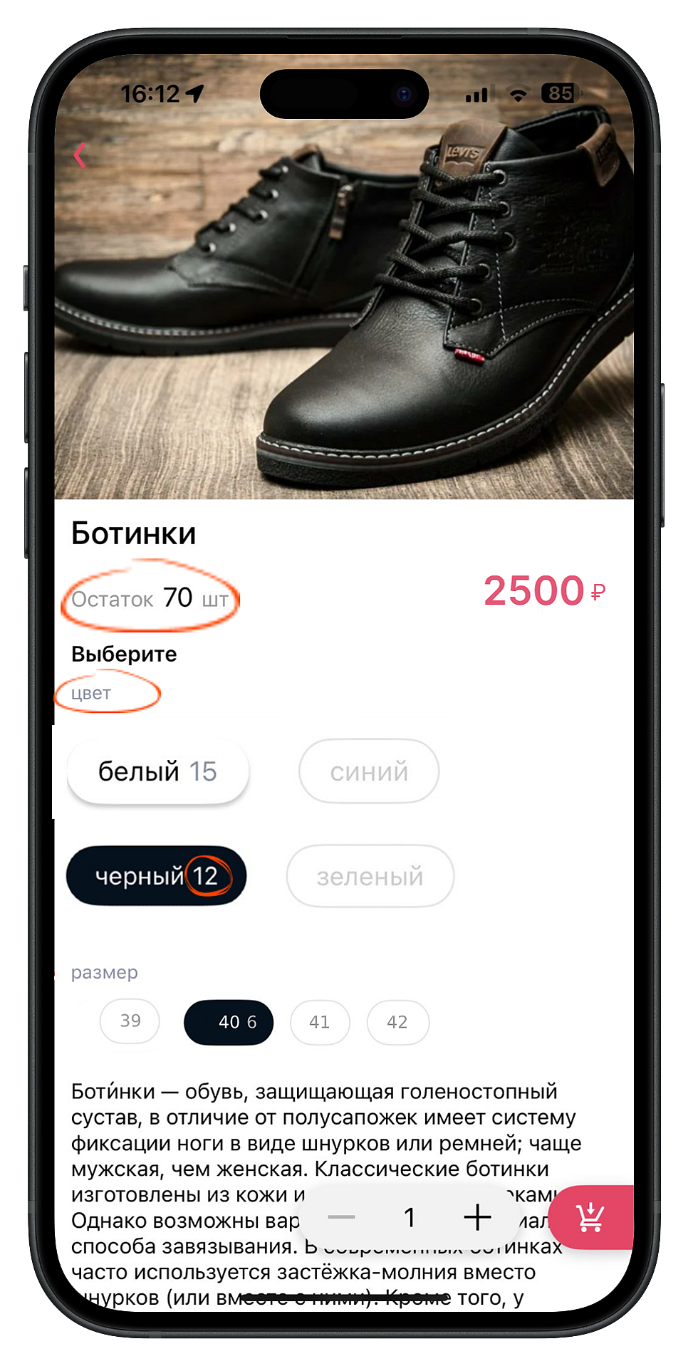 Чтобы товар оказался в корзине, пользователь должен указать размер, цвет и другие параметры на выбор. Карточка покажет количество товара в целом и по выбранным характеристикам: например, если в наличии всего 70 пар ботинок, а черного цвета — 12.