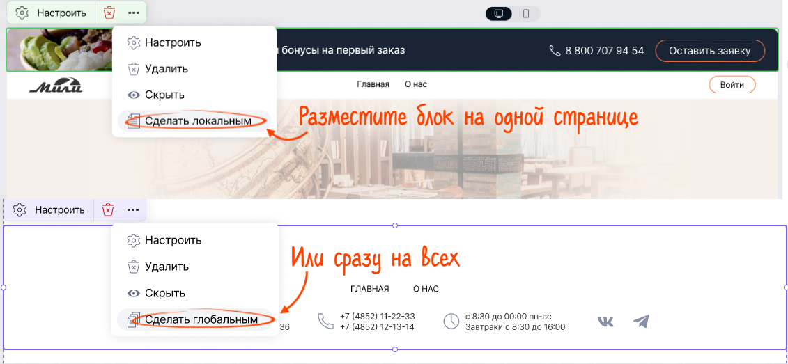 Еще одна фишка — блоки «Шапка» и «Подвал». Установили один раз — и они аккуратно работают на нужных страницах.