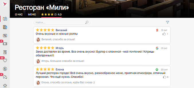 Настройте публикацию отзывов на Saby Get с подключенных площадок в разделе «Контакт-центр/Отзывы» — новые и существующие отзывы появятся на странице заведения.