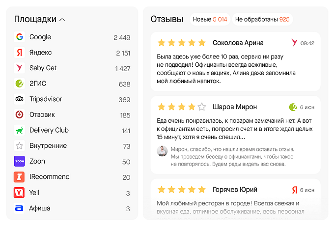 Теперь в Saby Get доступны не только отзывы, оставленные на сайте или в мобильном приложении. Гости добавят отзыв о вас на 2GIS, Google, Яндекс или другой популярной площадке, а Saby Get покажет их на странице заведения и учтет в рейтинге.
