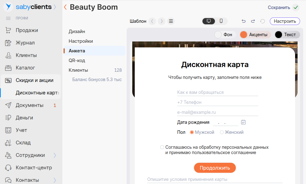 Обновили конструктор для анкеты дисконтной карты. Теперь в настройках можно выбрать шаблон, добавлять текстовые блоки, заголовки, виджеты с акциями, новостями или отзывами, а также собственные поля. Перед регистрацией карты клиент увидит актуальную информацию о заведении и укажет те данные, которые нужны вашему бизнесу. Возможность появится у всех пользователей до конца апреля.