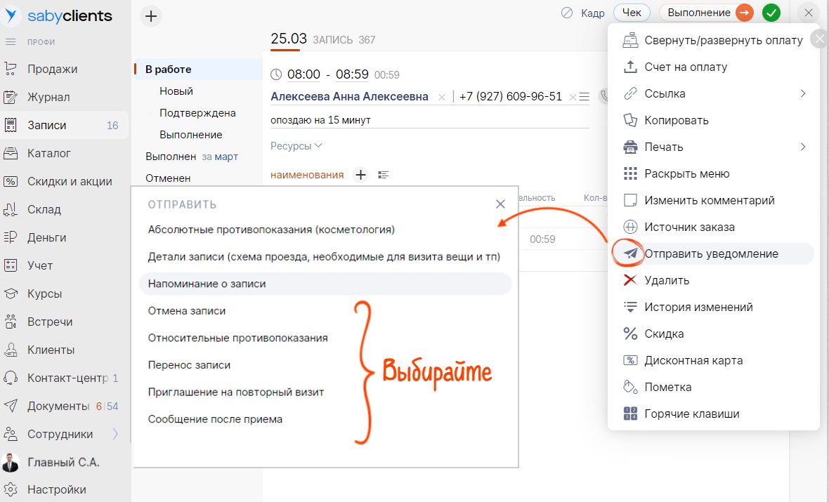 В карточке записи появилась кнопка «Отправить уведомление»: выберите один из готовых шаблонов или напишите текст вручную, укажите канал связи и контакт клиента.