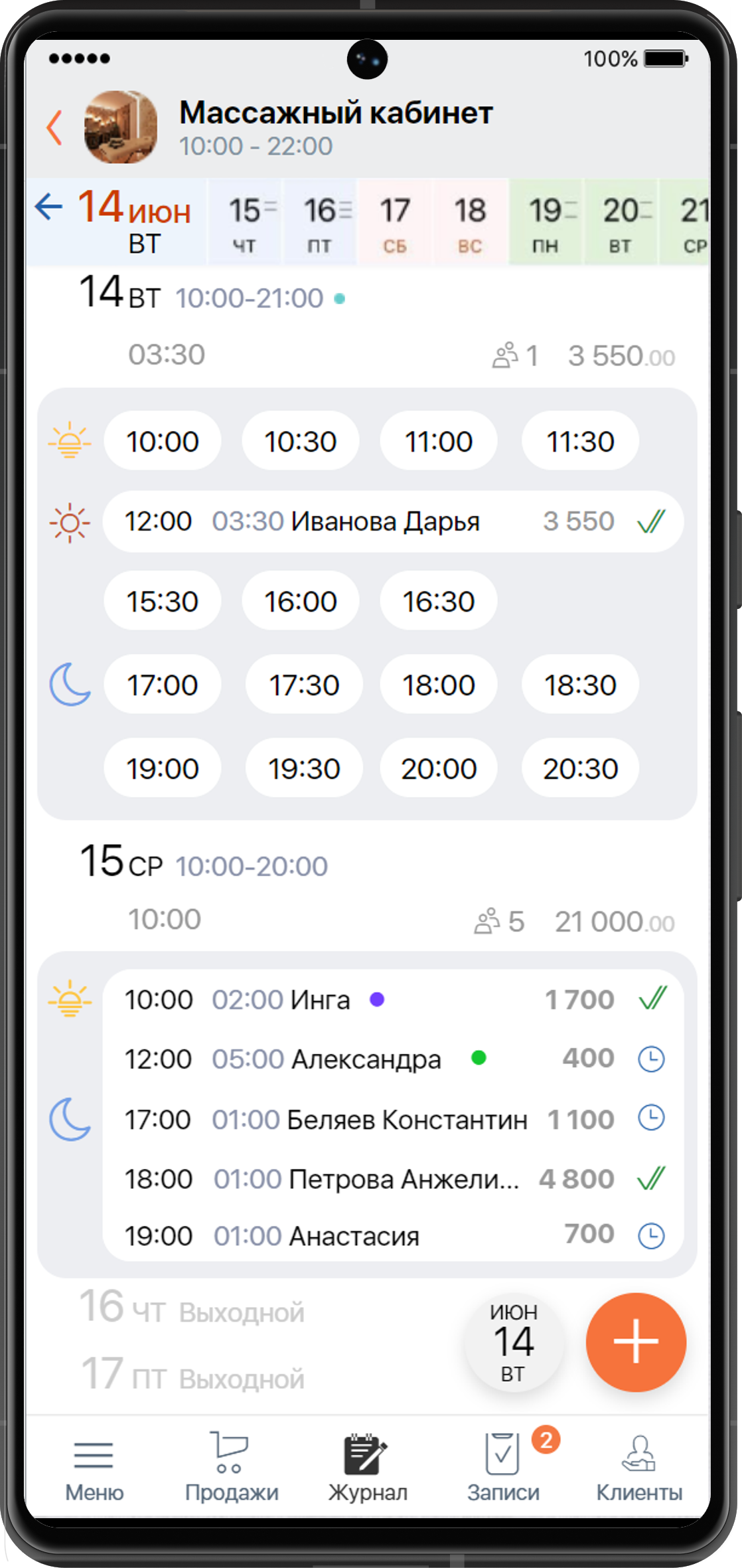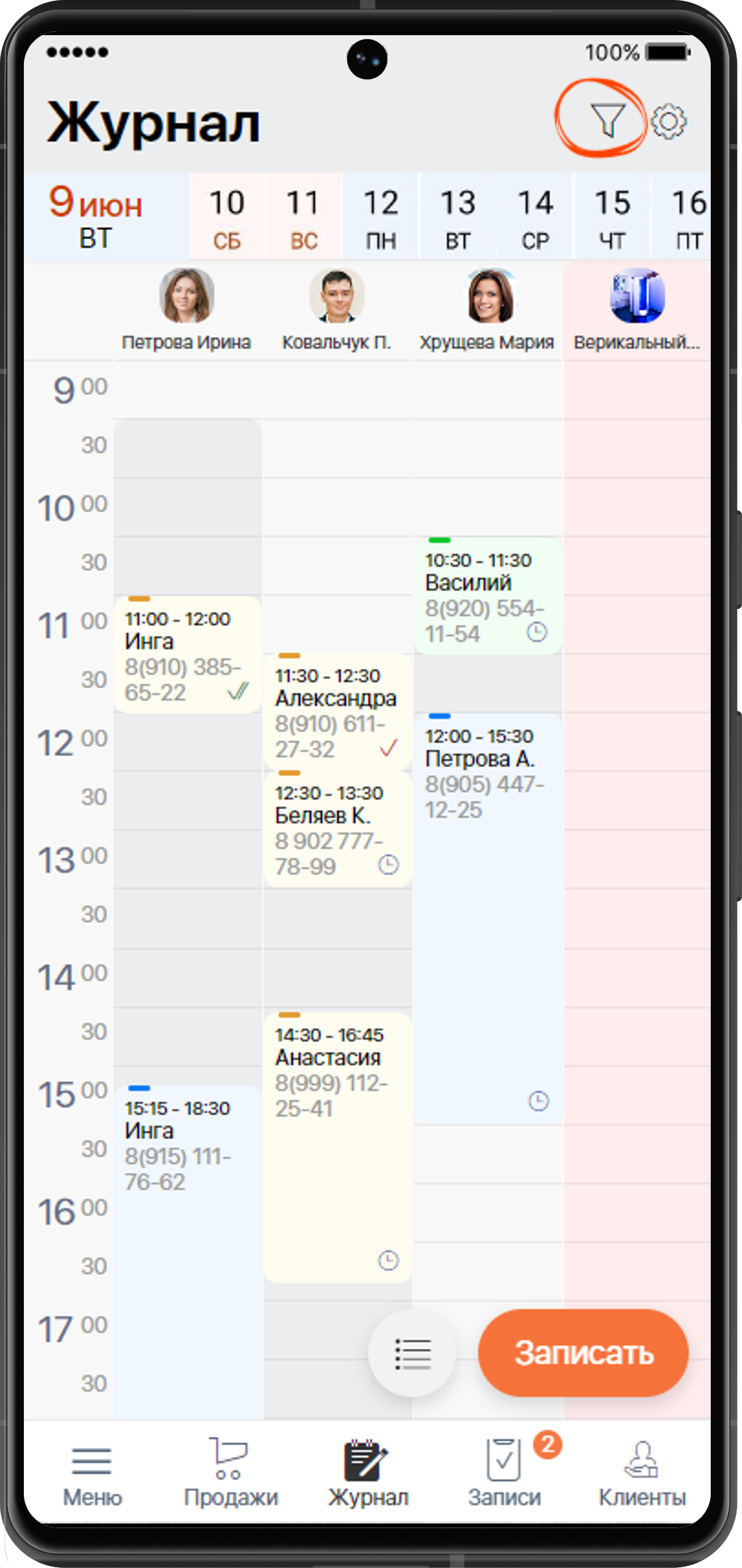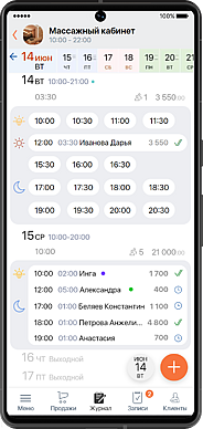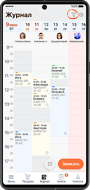 Записи всех мастеров — в экране телефона. Просматривайте общую нагрузку без переключений между календарями и легко находите нужные записи с помощью фильтров. Занимайте или освобождайте оборудование и помещения в пару касаний — без компьютера.