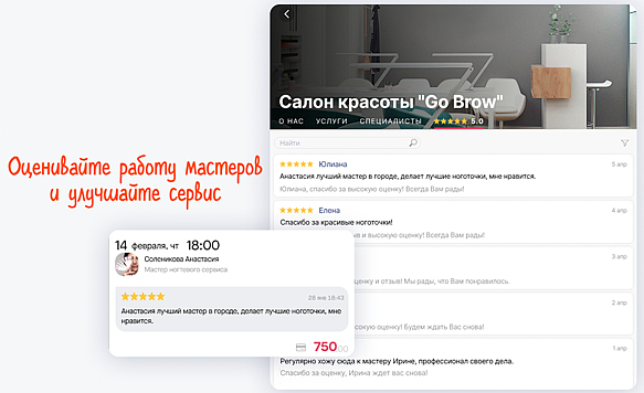 Нарабатывайте лояльность — с максимальной выгодой. Используйте гибкие настройки и выпускайте сертификаты на определенную сумму или на количество посещений. Добавьте поздравление, описание или отзывы — клиент приобретет или продлит сертификат самостоятельно. Сообщайте о важном в мессенджерах: рассказывайте клиентам о новинках, запускайте акции и отправляйте персональные предложения прямо из системы, в которой работаете. Настраивайте автоматические напоминания о записях и сокращайте неявку клиентов на 30%. Команда формирует лицо бизнеса: Saby покажет общую картину в карточке заведения и как оценки влияют на общий рейтинг. Если клиент ставит ниже 5 звезд, система попросит написать комментарий — вы всегда будете знать причину. А еще — сразу в отзыве можно оставить чаевые. Приятный бонус.