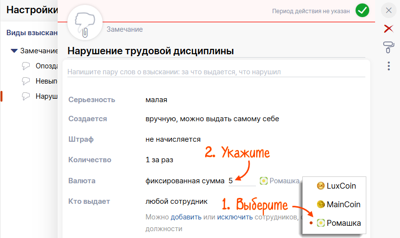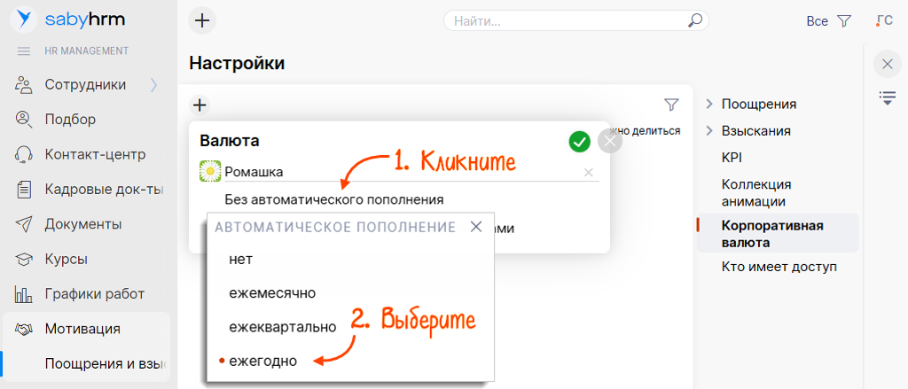 Настройте регулярное начисление с определенной периодичностью: раз в месяц, квартал или год. Например, 1 числа каждого года сотрудники получают Ромашки, которые могут потратить в корпоративном магазине.