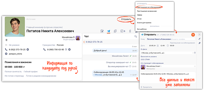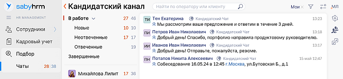 Вы можете инициировать общение из Telegram и WhatsApp или продолжить диалог в любом мессенджере. Для этого перейдите в новый раздела «Подбор/Чаты» или в карточку кандидата, где есть сведения по соискателю.